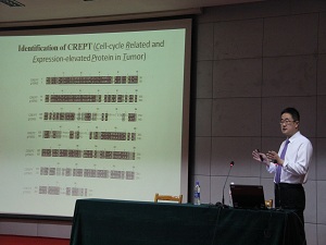 随后张衍泉从Wnt信号通路的正向和逆向调控蛋白入手,通过蛋白质命名原理、肿瘤的观察、标本的染色、mRNA生成等方面与在座师生探讨关于“CREPT enchances the transcriptional activity of b-cateninl/TCF4 in response to Wnt signaling(CREPT蛋白调控Wnt信号通路的研究) ”的学术性的研究。